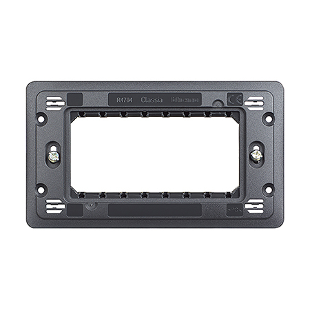 Bticino Classia R4704 je nosač mehanizma (support frame) za poklopne maske/okvire od 4 modula, namenjen za stabilnu i preciznu montažu modularnih uređaja. Inovativan sistem regulacije/poravnanja i čvrstoća materijala omogućavaju da maska i mehanizam budu ravno nalegnuti na zid, uz uredan estetski rezultat, posebno kod višemodulnih instalacija.